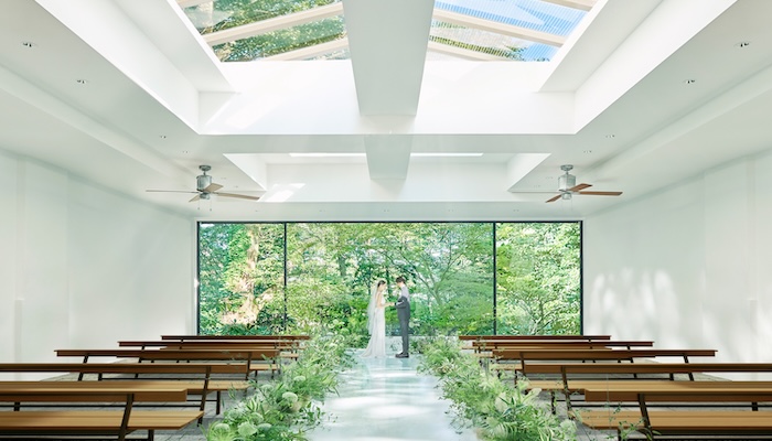 光溢れるガラス張りのチャペルでのセレモニーと